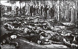 They followed the highway for about ten miles, and then were turned off toward the right, and marched up into the mountains. Soon after passing the crest of the ridge, they were marched down into a deep ravine, where they were ordered to sit on the ground. When they were all seated, bound as they were, their guards, with their rifles and bayonets, fell upon them and commenced a butchery that the imagination refuses to picture.
